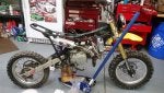 I had a 1997 Kawasaki KX80 frame, swingarm, and rear wheel in my storage barn I got for cheap with a bunch of other dirt bike parts. After some measuring I test fit the swingarm. It was a very good fit. With one washer on each side and 12mm to 10mm shims it was a perfect fit. This took care of the short swingarm problem but required upgrade the 600mm forks I had to 735mm forks to match the extra height the KX80 rear end would require.